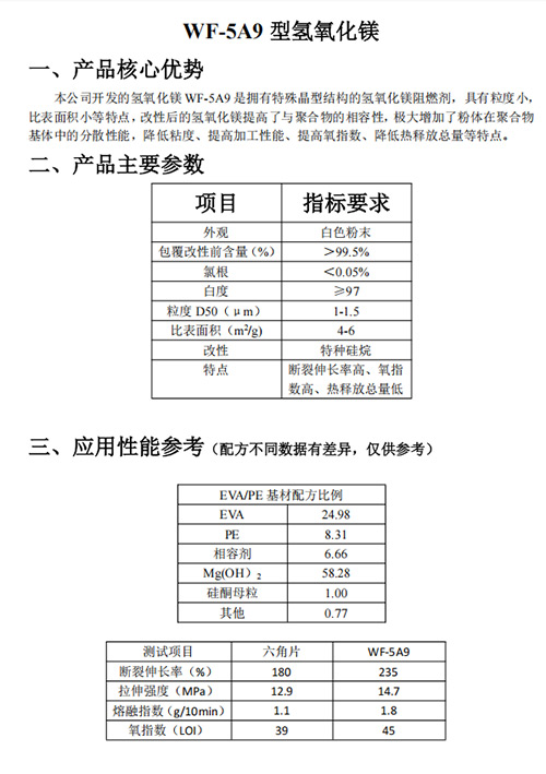 本公司开发的氢氧化镁 WF-5A9 是拥有特殊品型结构的氢氧化镁阻燃剂,具有粒度小,比表面积小等特点,改性后的氢氧化镁提高了与聚合物的相容性,极大增加了粉体在聚合物基体中的分散性能,降低粘度、提高加工性能、提高氧指数、降低热释放总量等特点。